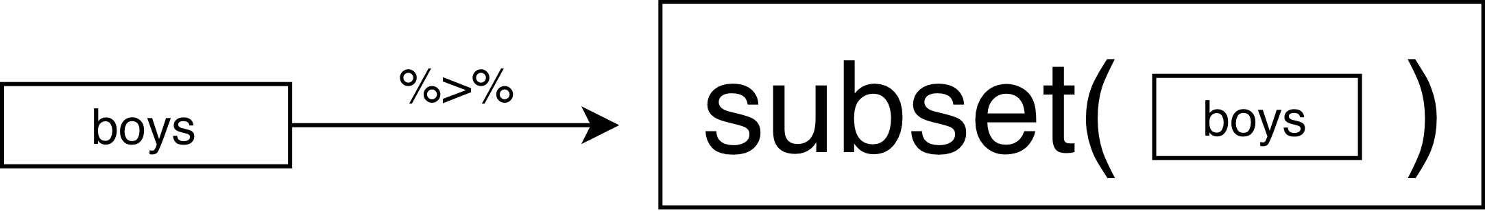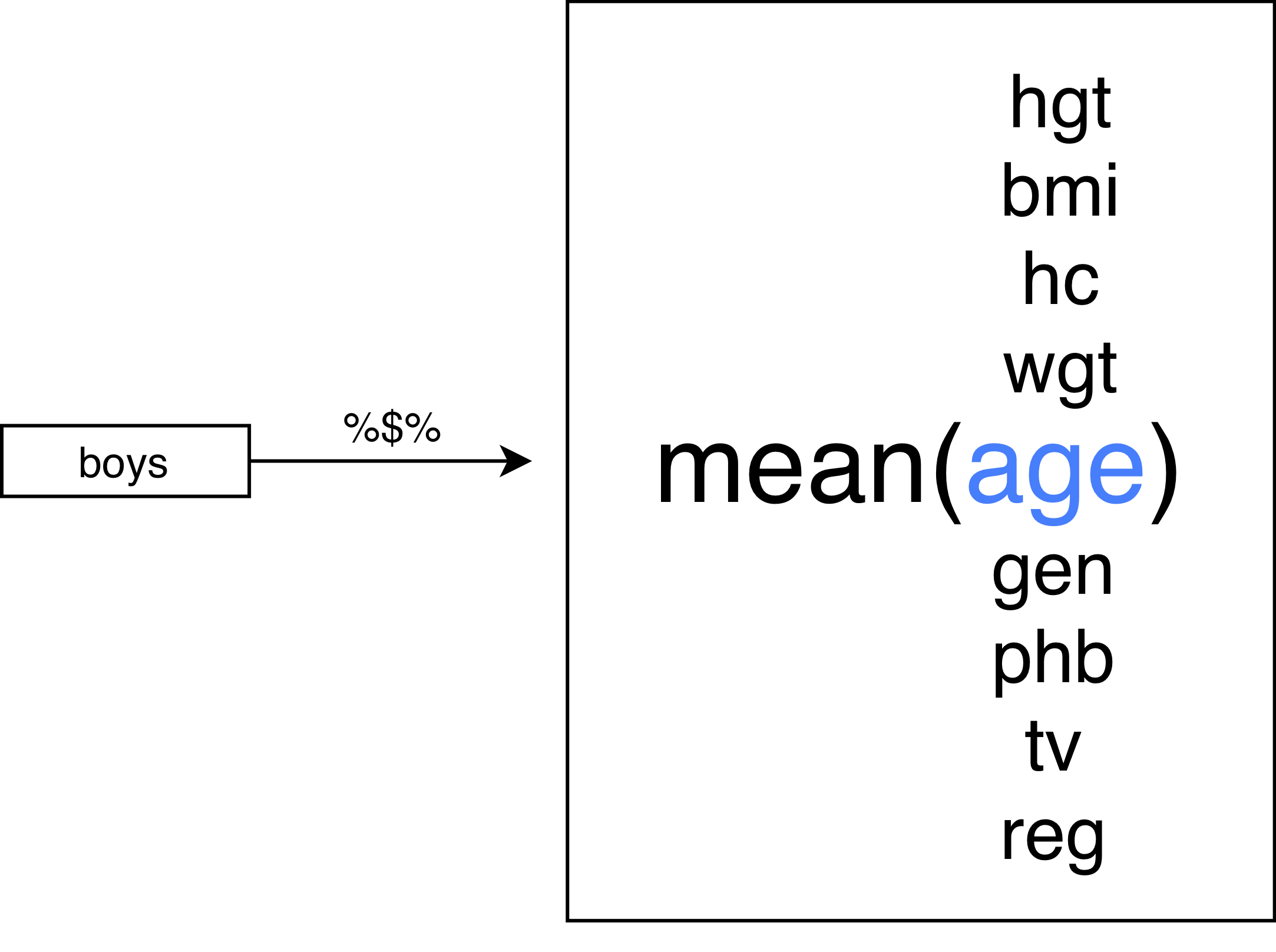 f(x) becomes x %>% f()f(x, y) becomes x %>% f(y) age hgt wgt bmi hc gen phb tv reg