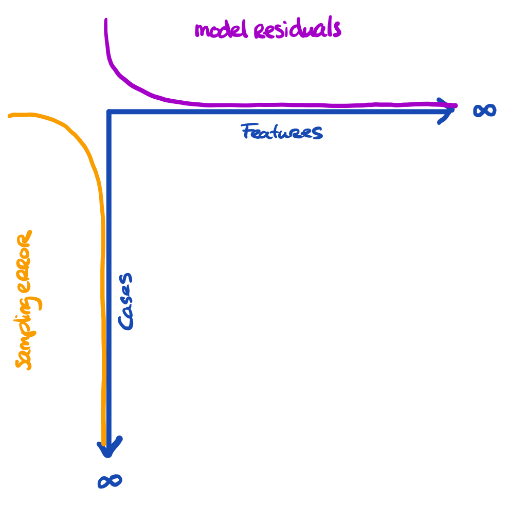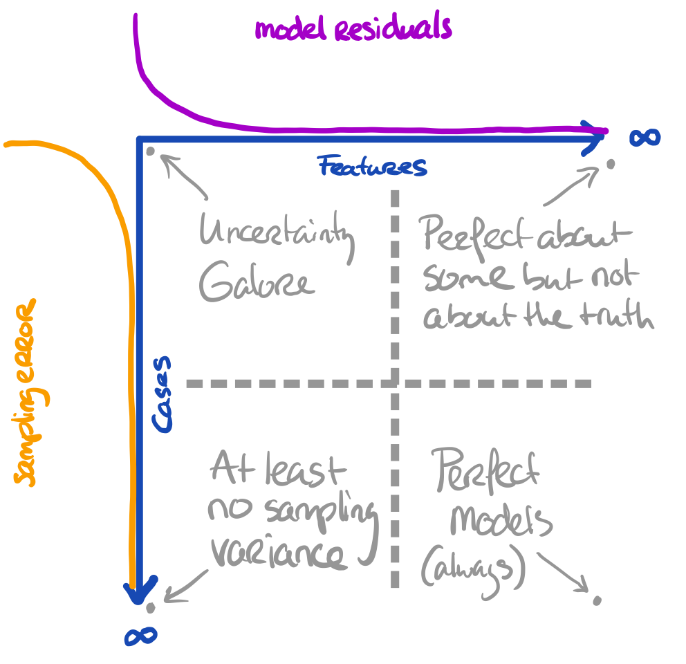 All these things are related to uncertainty. Our model can still yield biased results when fitted to \(\infty\) features. Our inference can still be wrong when obtained on \(\infty\) cases.